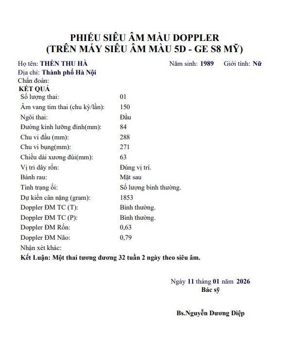 Phòng khám Sản phụ khoa 88B chúc mừng mẹ Thèn Thu Hà đã hoàn thành buổi thăm khám và siêu âm định kỳ vào ngày 11/1/2026.