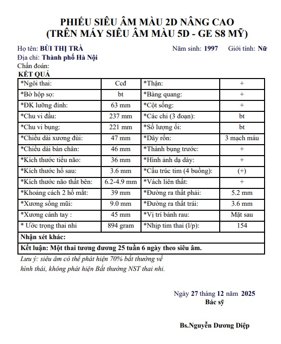 Dưới đây là hồ sơ kết quả siêu âm chi tiết được thực hiện và trực tiếp phân tích bởi Bác sĩ Nguyễn Dương Diệp